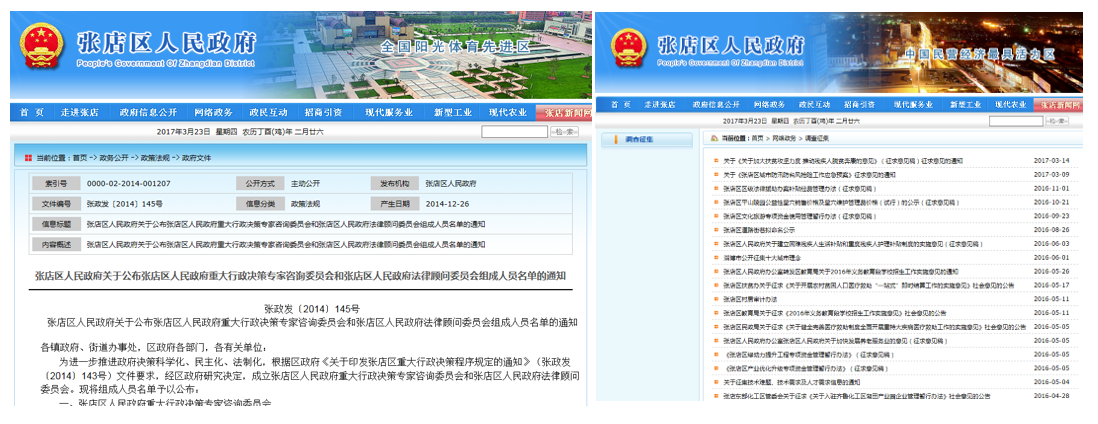 張店區(qū)先后印發(fā)了《張店區(qū)重大行政決策程序規(guī)定》(張政發(fā)〔2014〕143號(hào))、《張店區(qū)人民政府關(guān)于公布張店區(qū)人民政府重大行政決策專(zhuān)家咨詢(xún)委員會(huì)和張店區(qū)人民政府法律顧問(wèn)委員會(huì)組成人員名單的通知》(張政發(fā)〔2014〕145號(hào))、2015年下發(fā)《張店區(qū)人民政府辦公室關(guān)于做好市政府重大行政決策草案公開(kāi)政策文件解讀及熱點(diǎn)回應(yīng)工作的通知》(張政辦字〔2015〕81號(hào))等文件,為使該項(xiàng)工作貫徹落實(shí)2016年又制定《張店區(qū)人民政府辦公室關(guān)于印發(fā)<張店區(qū)人民政府啟動(dòng)重大行政決策程序工作規(guī)則>的通知》(張政辦發(fā)〔2016〕23號(hào)),進(jìn)一步明確了重大行政決策的啟動(dòng)程序,為重大行政決策的界定和草案規(guī)范公開(kāi)奠定了基礎(chǔ)。重大行政決策事項(xiàng)適合通過(guò)公開(kāi)草案方式組織公眾參與的其草案均通過(guò)區(qū)政府門(mén)戶(hù)網(wǎng)站《規(guī)范性文件草案意見(jiàn)征集》和《調(diào)查征集》欄目進(jìn)行公開(kāi)征求意見(jiàn)以便公眾參與。2016年公開(kāi)對(duì)“關(guān)于建立困難殘疾人生活補(bǔ)貼和重度殘疾人護(hù)理補(bǔ)貼制度的實(shí)施意見(jiàn)”、“關(guān)于征求《關(guān)于開(kāi)展農(nóng)村貧困人口醫(yī)療救助’一站式’即時(shí)結(jié)算工作的實(shí)施意見(jiàn)》社會(huì)意見(jiàn)的公告”、“區(qū)級(jí)法律援助辦案補(bǔ)貼經(jīng)費(fèi)管理辦法”、“張店區(qū)會(huì)展經(jīng)濟(jì)發(fā)展扶持獎(jiǎng)勵(lì)資金使用管理辦法”等事項(xiàng)征求了意見(jiàn)。