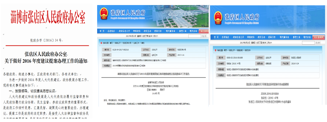 年初制定下發(fā)了《關(guān)于做好2016年度建議提案辦理工作的通知》(張政辦字〔2016〕34號(hào)),提出“誰(shuí)主辦、誰(shuí)答復(fù)、誰(shuí)公開(kāi)”和“先審查、后公布、誰(shuí)負(fù)責(zé)”的原則,要求各辦理單位對(duì)于涉及公共利益、公眾利益、社會(huì)關(guān)切及需要社會(huì)廣泛知曉的建議、提案辦理復(fù)文,經(jīng)審查可以公開(kāi)的,采取摘要的形式予以公開(kāi)或者通過(guò)宣傳欄、新聞媒體等多種渠道予以公開(kāi)。按照部署積極穩(wěn)妥的推進(jìn)全區(qū)審計(jì)情況清單和審計(jì)結(jié)果公開(kāi)。完善并修訂了《關(guān)于進(jìn)一步加強(qiáng)審計(jì)整改落實(shí)工作的實(shí)施意見(jiàn)》,對(duì)審計(jì)中查出的問(wèn)題,按照要求及時(shí)通過(guò)區(qū)政府門(mén)戶(hù)網(wǎng)站公開(kāi)審計(jì)整改情況清單;公開(kāi)發(fā)布《2015年度區(qū)級(jí)預(yù)算執(zhí)行和其他財(cái)政收支情況的審計(jì)工作報(bào)告》同時(shí)受區(qū)政府委托,向區(qū)人大常委會(huì)報(bào)告審計(jì)查出問(wèn)題整改情況,督促被審計(jì)單位查找不足,完善制度,使問(wèn)題整改工作制度化、長(zhǎng)效化,增強(qiáng)監(jiān)督的針對(duì)性和實(shí)效性。2016年印發(fā)公開(kāi)發(fā)布了《淄博市張店區(qū)人民政府關(guān)于印發(fā)張店區(qū)村居審計(jì)辦法的通知》(張政發(fā)〔2016〕47號(hào)),明確規(guī)定區(qū)審計(jì)局可以將村居審計(jì)結(jié)果按照有關(guān)規(guī)定向社會(huì)公布。