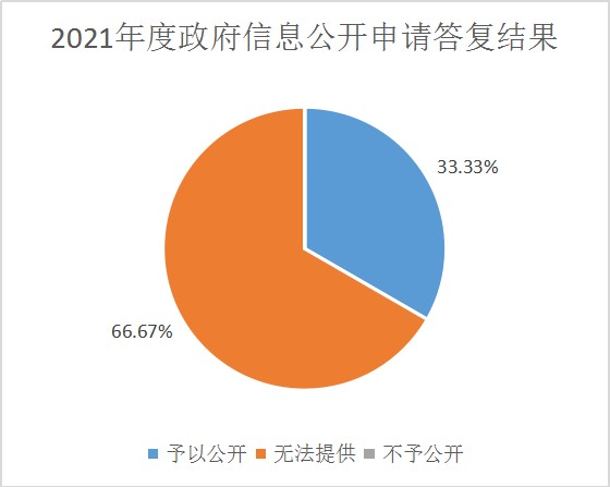 2021年度,我單位辦理政府信息公開申請3件,其中自然人3件,商業(yè)企業(yè)申請0件,科研機構(gòu)申請0件。申請內(nèi)容主要包括:處罰繳納罰款憑證、征收補償費用??顚S米C明材料、疫情期間復(fù)工復(fù)產(chǎn)財政政策。共作出政府信息公開答復(fù)書3件,其中予以公開1件,占33.33%,不予公開0件,占0%,無法提供2件,占66.67%。