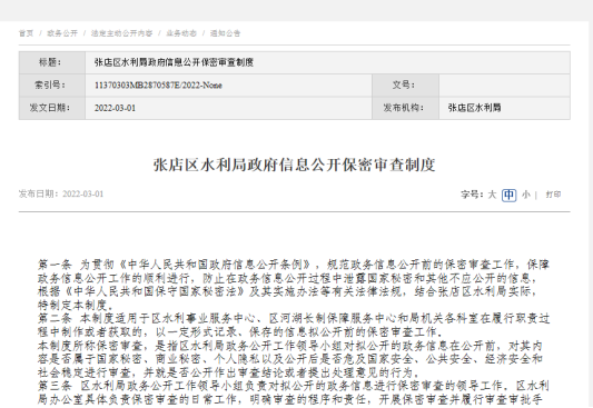 (三)政府信息管理。一是在《張店區(qū)人民政府信息主動公開目錄》的基礎上,結合本單位職能,印發(fā)了《張店區(qū)水利局信息主動公開基本目錄》,以條目形式逐項細化分類,明確事項名稱、公開內容和公開主體等,形成了公開事項清單,讓社會群眾對本單位公開事項一目了然。二是加強政府信息公開保密審查工作的制度化、常態(tài)化、規(guī)范化建設,制定了《張店區(qū)水利局政府信息公開保密審查制度》,將政府信息公開保密審查與公文運轉、信息發(fā)布結合起來,防止保密審查與政府信息公開工作脫節(jié)。三是做好主動公開內容更新維護,加強預警信息公開,2023年汛期共公開雨情信息8條,為市民生活生產、日常出行等提供決策依據。同時對本單位領導信息變動、政策文件發(fā)布、行政執(zhí)法信息、部門會議等重要信息進行了實時更新。