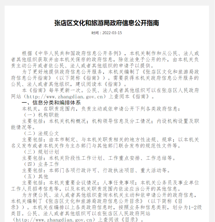 (三)政府信息管理情況。一是我局高度重視政府信息公開工作,成立了由黨組書記、局長任組長的政務信息公開領導小組。領導小組下設辦公室,負責與政務信息公開有關的各項工作。二是建立健全單位年度信息公開工作方案、依申請公開制度及工作流程,對政府信息公開的信息送交、工作規(guī)程等具體工作進行規(guī)范,明確了全系統(tǒng)政府信息公開工作的組織架構、工作職責。三是將政府信息分為主動公開、依申請公開、不予公開三類,并按規(guī)范編制《張店區(qū)文化和旅游局信息公開指南》。
